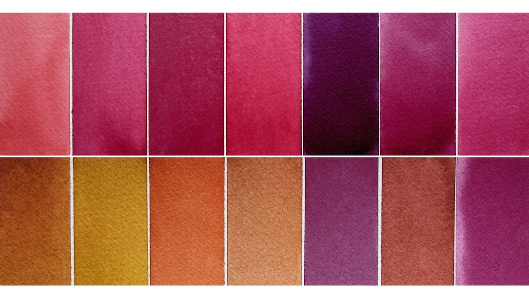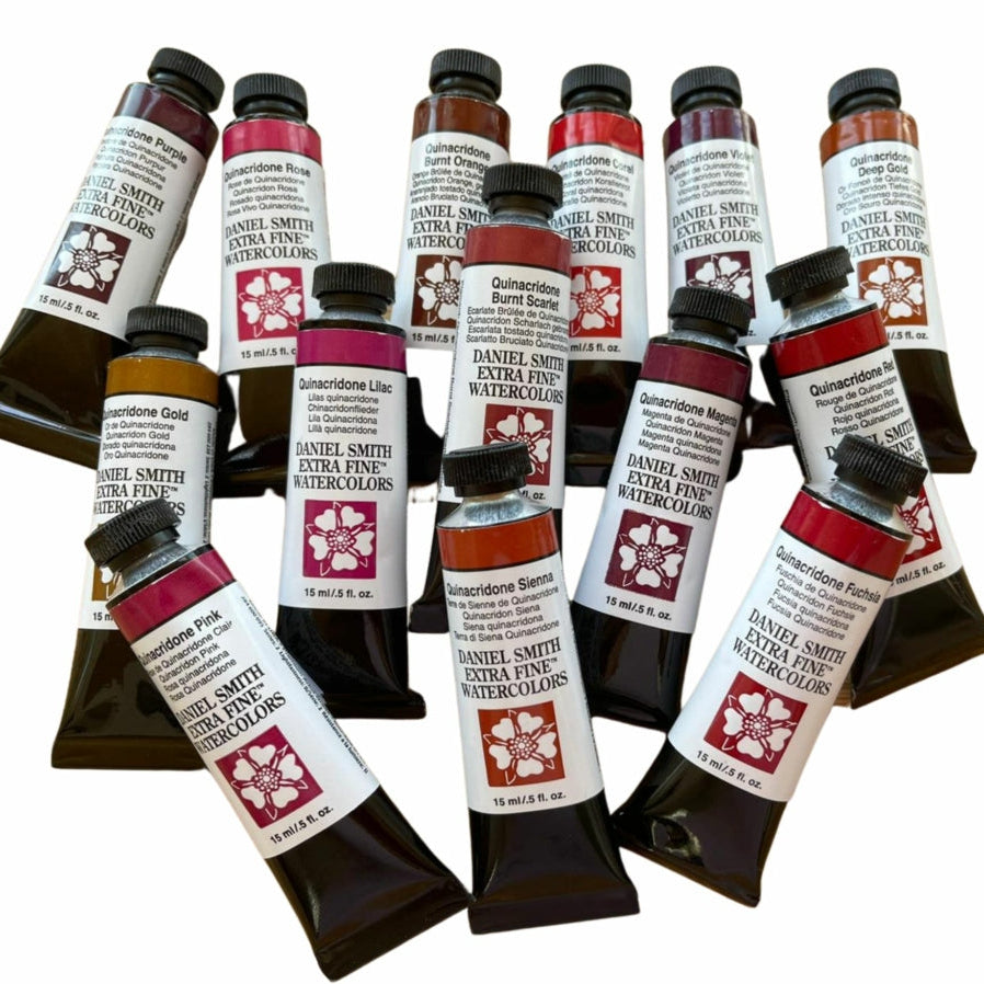 The Quinacridones (which also includes five more Quins in the gold-sienna-orange range of colors) were developed for the automotive industry which needed highly lightfast and durable colors. When the quinacridone pigments are made into artist paints, the watercolors are very transparent, non-granulating and have either Excellent (100+ years) or Very Good (100 years) Lightfastness.