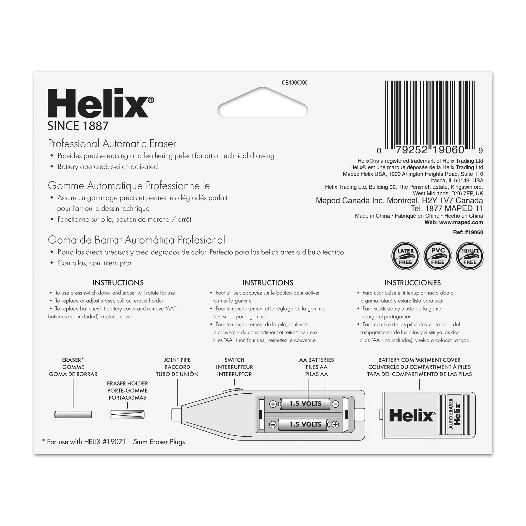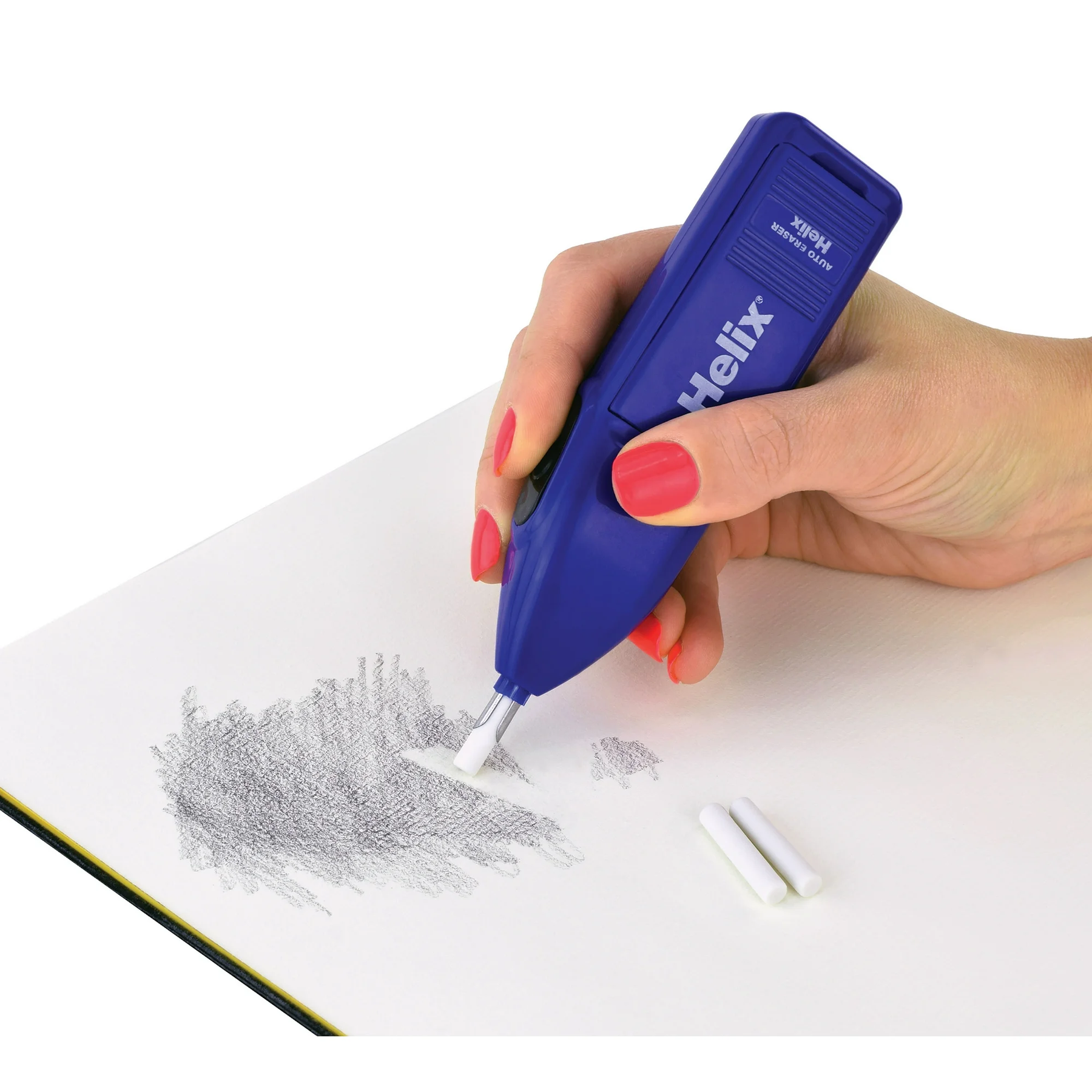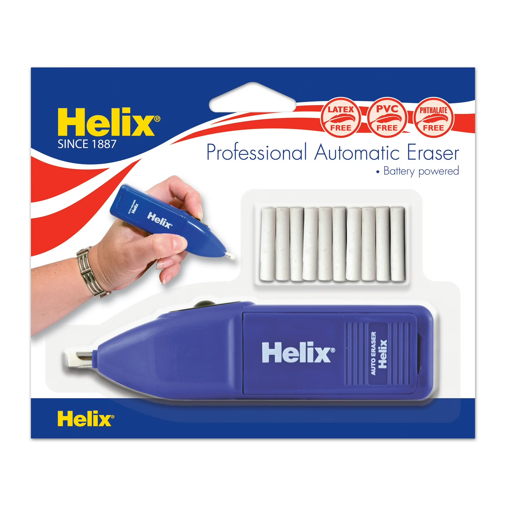 Helix Auto Eraser hace que borrar sea fácil y divertido. Eraser incluye diez recambios blancos para borrar lápiz. El borrador mide aproximadamente 5 1/2 pulgadas de largo. Dos pilas AA no incluidas.